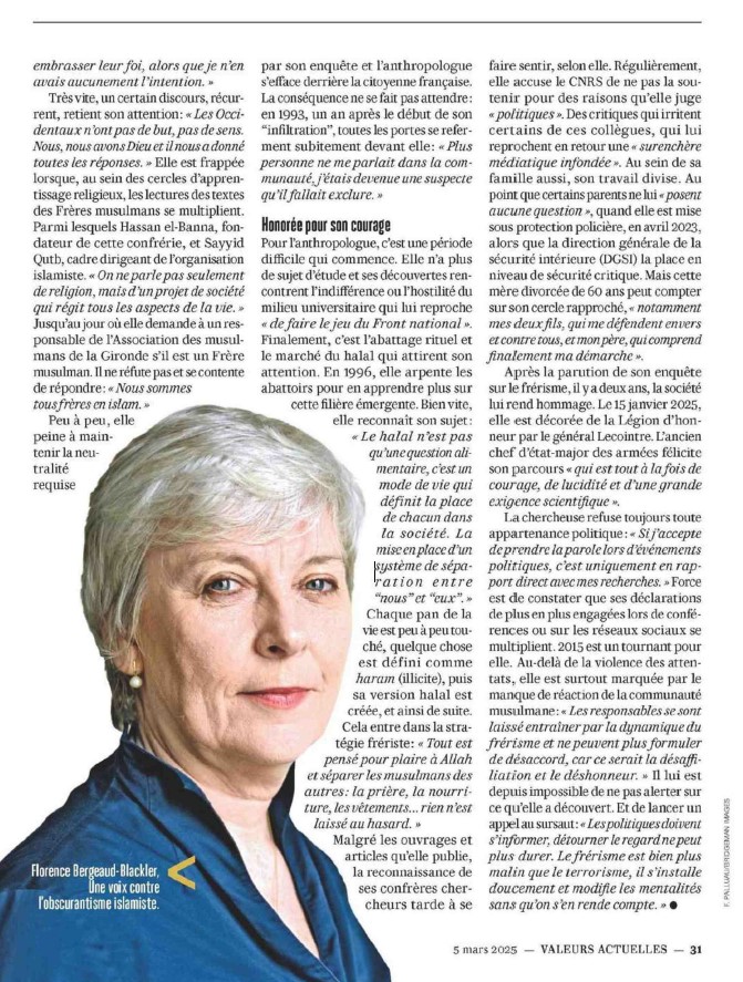 Le magazine ** revient, cette semaine, dans ses colonnes, sur le parcours de la présidente du CERIF, Florence Bergeaud-Blackler. Un article où l’anthropologue évoque les raisons de son engagement, ses débuts comme chercheuse, l’hostilité progressive dont elle a été l’objet, tant auprès des musulmans radicaux que d’un certain milieu universitaire, et enfin sa récente décoration de chevalier de la Légion d’honneur. Un portrait que vous pouvez découvrir ci-dessous.